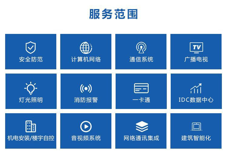 其业务范围主要有:视频监控安装/门禁考勤/综合布线/网络覆盖/广播音响/音视频会议/楼宇对讲。